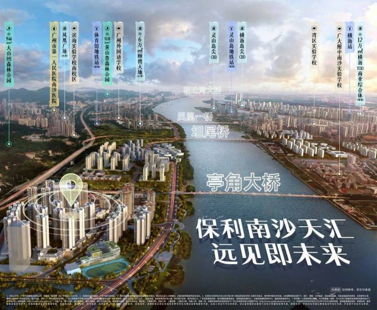 保利南沙天汇位于广州南沙黄阁南路与进港大道交界处,紧邻蕉门河水道,属于明珠湾起步区的黄阁亭角片区,与灵山岛尖隔江相望。