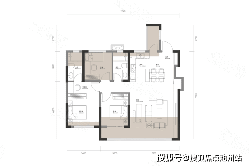 建面约95㎡三房两厅两卫,三开间朝南,南向面宽约11.5米,更大一些。客厅开间做到了约5.1米,也可以加一张开放式书桌,改造为3+1房。餐厅外面还带阳台,南北双阳台设计。