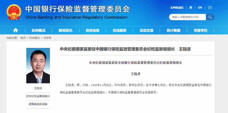 王陆进任中央纪委国家监委驻银保监会纪检监察组组长
