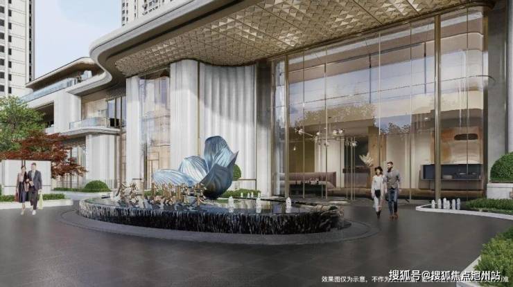 门前两侧是丛生元宝枫,中央水台形如聚宝盆,中央还矗立着海棠花雕塑。
