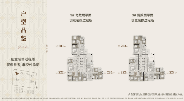 3栋203-227㎡:50层高,4梯3户设计,5.1-8米宽厅布局,23㎡全赠送共享平台,部分户型实现南北双阳台对流。