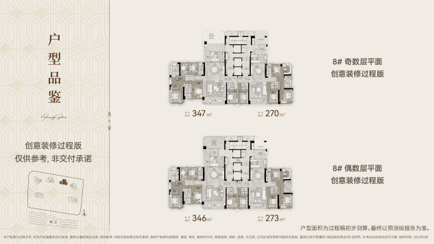 6/8栋270-347㎡:49层高,3梯2户配置,5.7-7.9米宽厅设计,奇数层配备32㎡6.6米通高平台空间。