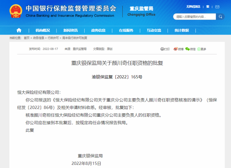文件显示,核准颜川奇担任恒大保险经纪有限公司重庆分公司主要负责人的任职资格。