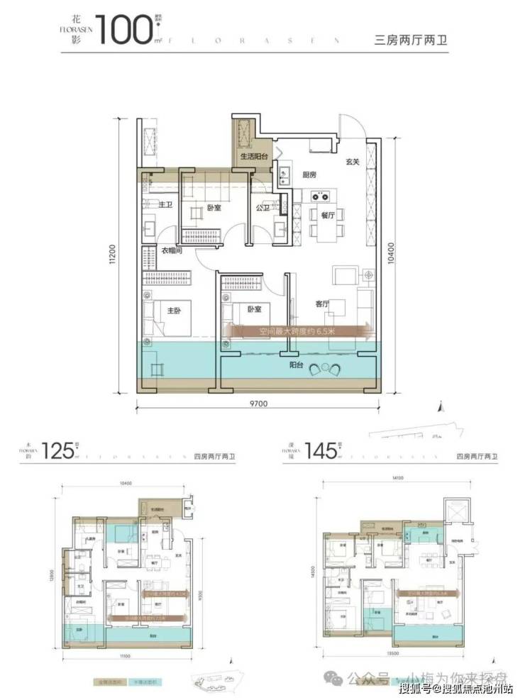 从规划方案来看,该项目由3栋18-33F住宅和部分社区底商组成,体量不大,总户数308户。项目主推建面约100、125、145㎡三房、四房,打造新四代住宅,约95-105%超高得房率。