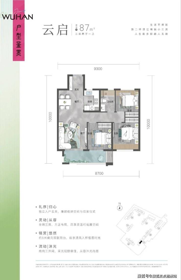 该户型是项目入门级产品,面积更小、总价更低,建面约87平做三房,且南向约5米大阳台,同面积段中,功能性和舒适度都比较高。