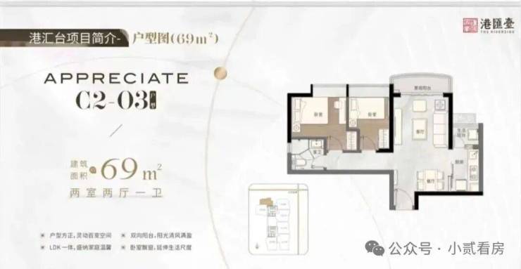 二期是商业、住宅、写字楼综合体,港汇台正是其中的住宅区,分C1、C2两栋,主推69-144㎡二房至四房。