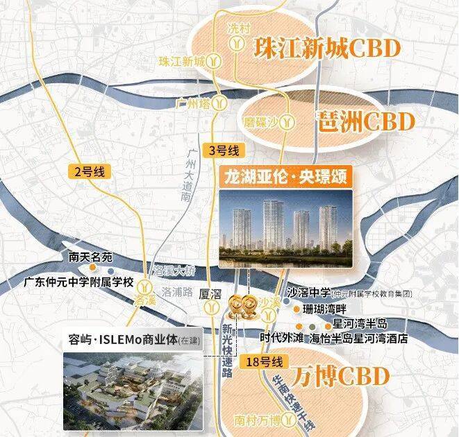 项目周边有双地铁,18号线+3号线可以直达珠江新城、琶洲等核心就业区,通勤便利。距离18号线沙溪地铁站约600-700米,18号线1站万博,2站琶洲,3站珠江新城。去3号线厦滘站有1公里左右,电鸡接驳比较方便。