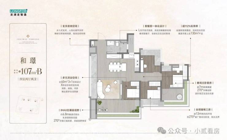 【107㎡】14.5米南向面宽+6.8米超大阳台对流+首创独立阳光女神衣厅+改善首选 约6.8米超大阳台,4.2米超大客厅开间,近38㎡LDK设计,首创独立阳光女神衣厅,新潮实用,约6.8米 270°环幕观景窗,舒居大四房改善必选!