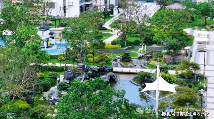 还有形态各异的山石,自然旱溪结合景石小桥,蜿蜒流淌与绿植相应成趣。