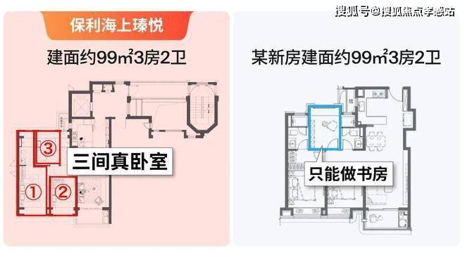 从居住舒适度来说:保利海上瑧悦建面约99㎡是正3房,而低得房率的户型只能是2房+1个功能房。