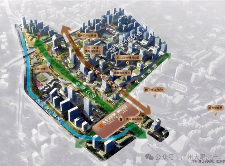 将采用“水岸共生”理念,以白海面涌为生态主轴,构建滨水慢行廊道。同时沿嘉禾望岗上盖设施打造景观化中轴公园,塑造片区创意活力。(非项目配建,以政府官方公示为准)