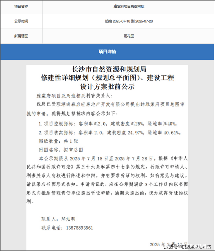2025年7月17日,长沙市自然资源和规划局对雅棠府项目进行批前公示,项目辖区显示为雨花区。项目所在的会展板块原行政划分属于长沙县,但近期板块内的公示信息中,辖区均已表述为雨花区。