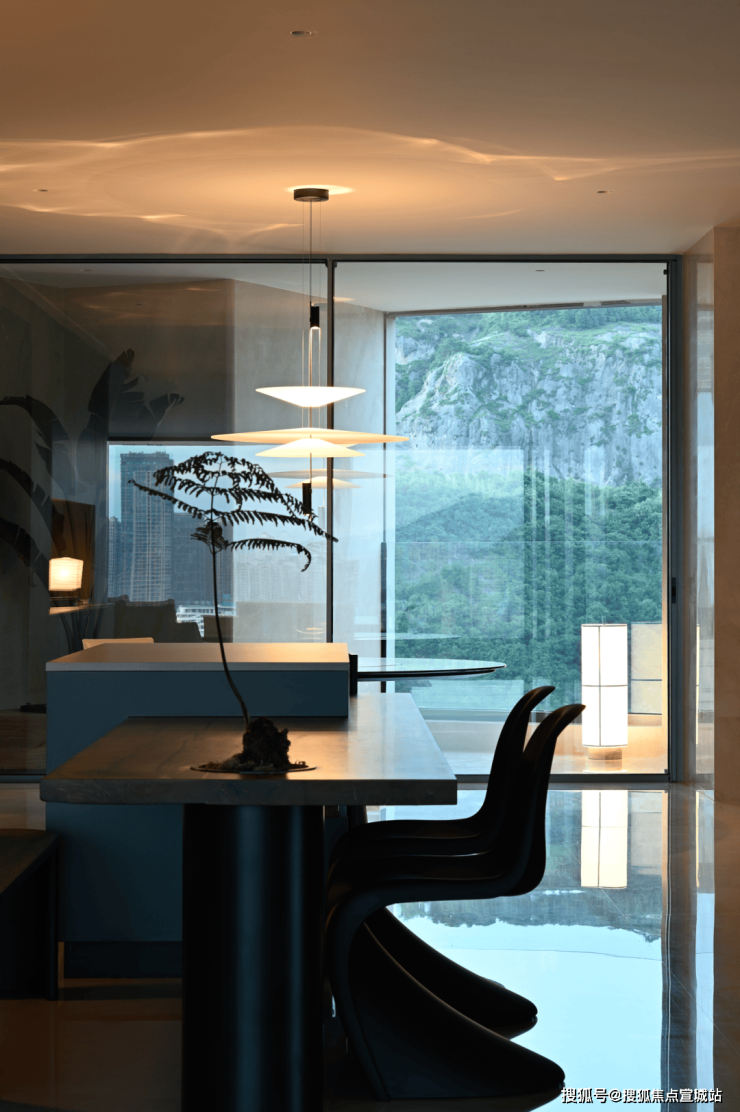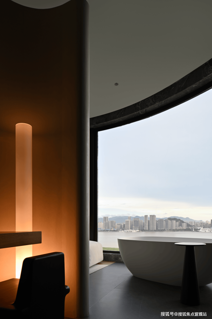 而至于城市的边界感,则来自于围绕整个空间的江水与山林.远处林立的高楼,蔚蓝的湖面,层起的山川与一望无际的天空……一日中最寂静的时刻,你于窗前落座,这山水也好,这都市也罢,早已融为一体.