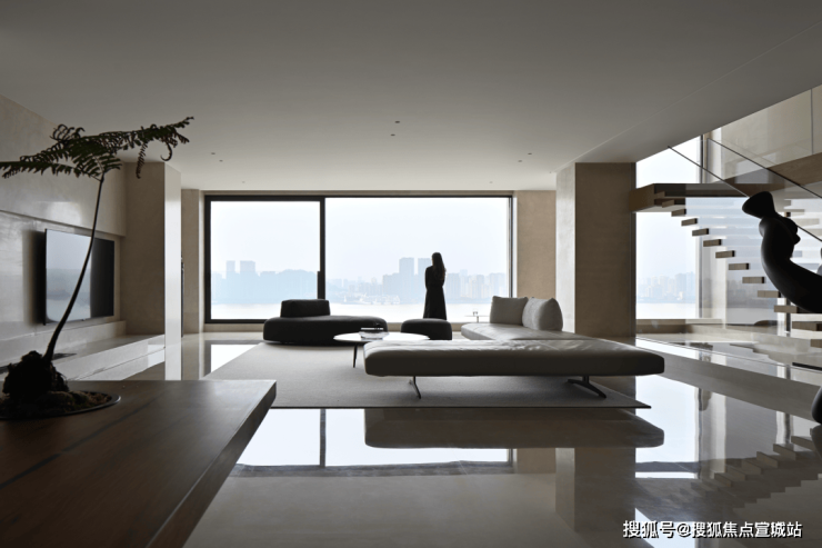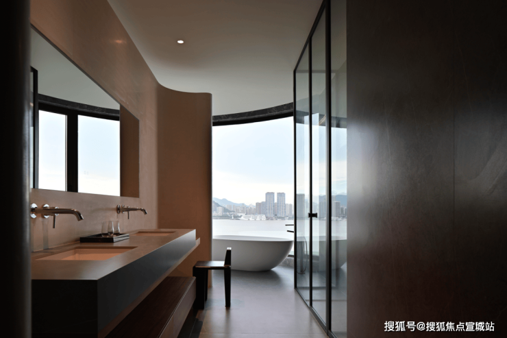 私宅空间的结构,本无定式.为环绕的江景不被打断,设计师大胆地打开主卧与卫生间的关系,将这连绵的江景恣意地引入空间,连绵的波光自由呈现.