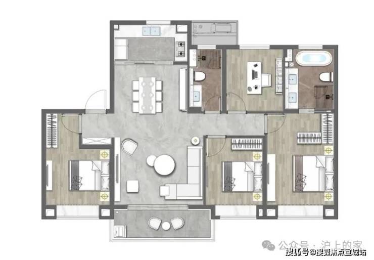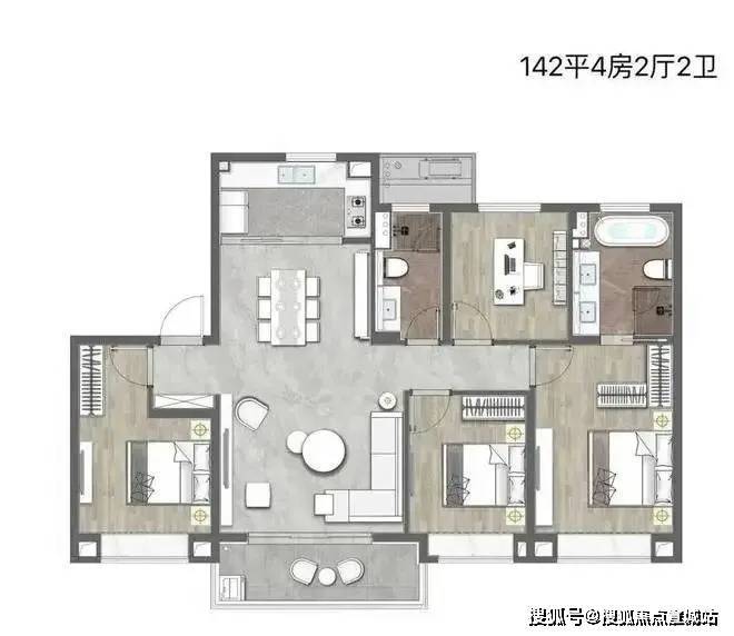 该户型做到了四开间朝南+南北通透+主卧套房设计+全南卧带飘窗,一步到位的大4房.