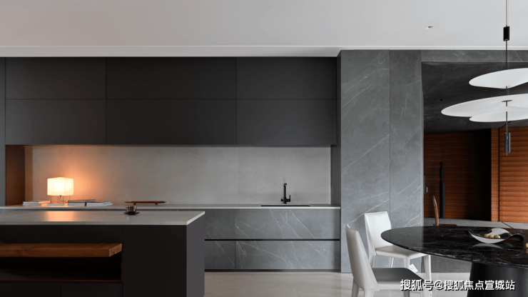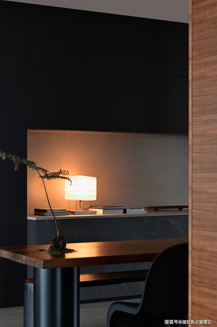 导台为链,串联起客餐厅间的对应关系.灰色起笔,黑色铺陈,落于眼中,是为沉静的艺术,两边皆为山水河畔,唯有这中间地带,以理性作为全部构成.自此,感性山水与理性建筑之间的界限破开,赋予空间动静相合之美.