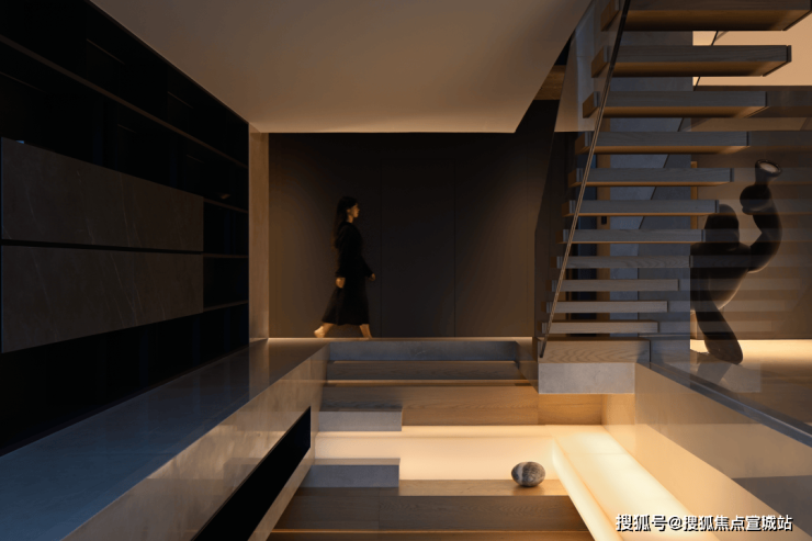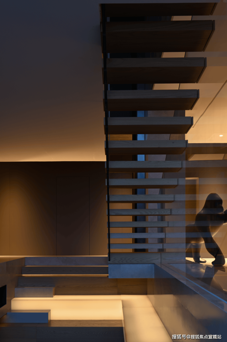 空间的主题落于项目中心的透明楼梯,在夜幕初降之时,楼梯的扶手仿佛消失于空气中,唯余步步阶梯,恍若悬空般层层而上,这亦是关于标题,“天空之境”的回答.