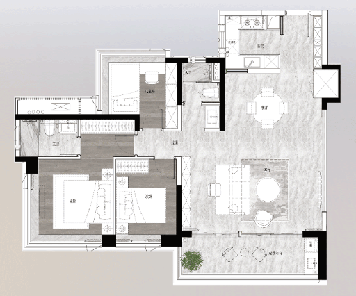 建筑面积105㎡的四房两厅两卫,四开间朝南,LDKB一体化设计,5.9m开间巨幕客厅,主卧270°全景飘窗。