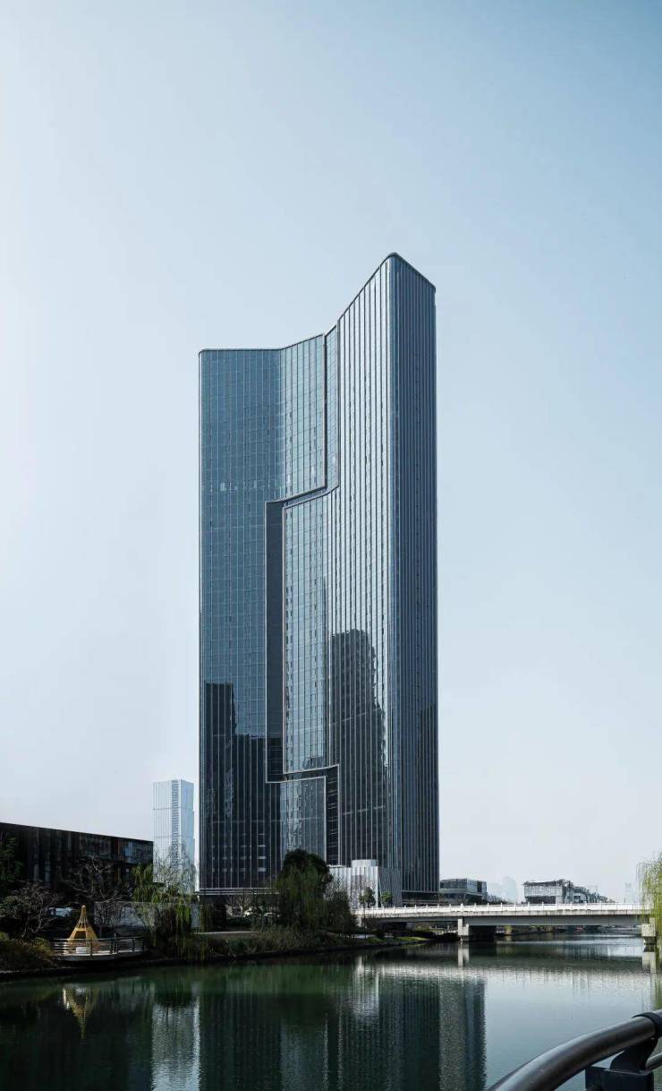 由Aedas主笔设计的主体,是约200米超高层建筑,灵感取自“高山流水”,垂直向下的线条如同“飞流直下三千尺”的叠瀑,代表杭州这座山水城市的文化底蕴,也颇像浙商心中“永立潮头、奔竞不息”千帆竞发的船帆,在整个杭州独树一帜。