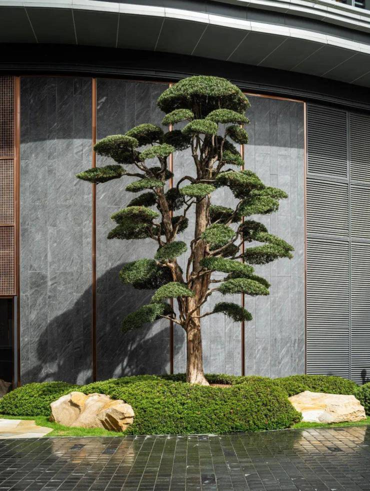 大面积的水系与遒劲的罗汉松包围着归家路,每一处景观都是由园艺师实地设计搭配,业主沿着景观回廊穿梭,在围合式山水之中感受风与自由,烦恼皆抛却天外,唯剩本心,云淡风轻。