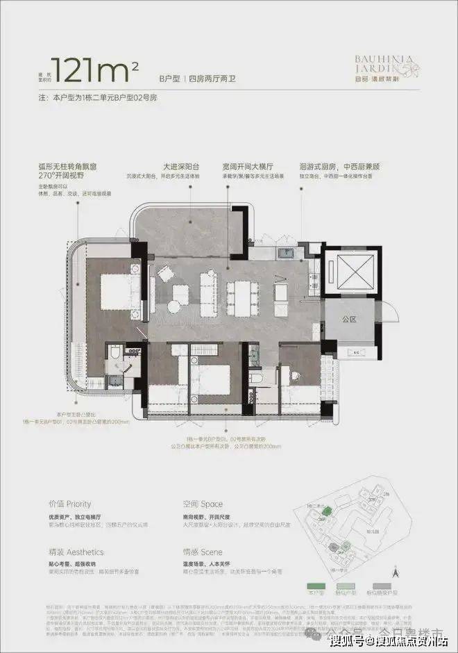 四房为主,多种厅式可选;大面积的飘窗利用,采光面大、实用率高;转角处使用弧形玻璃且都是无柱设计,景观视野佳;