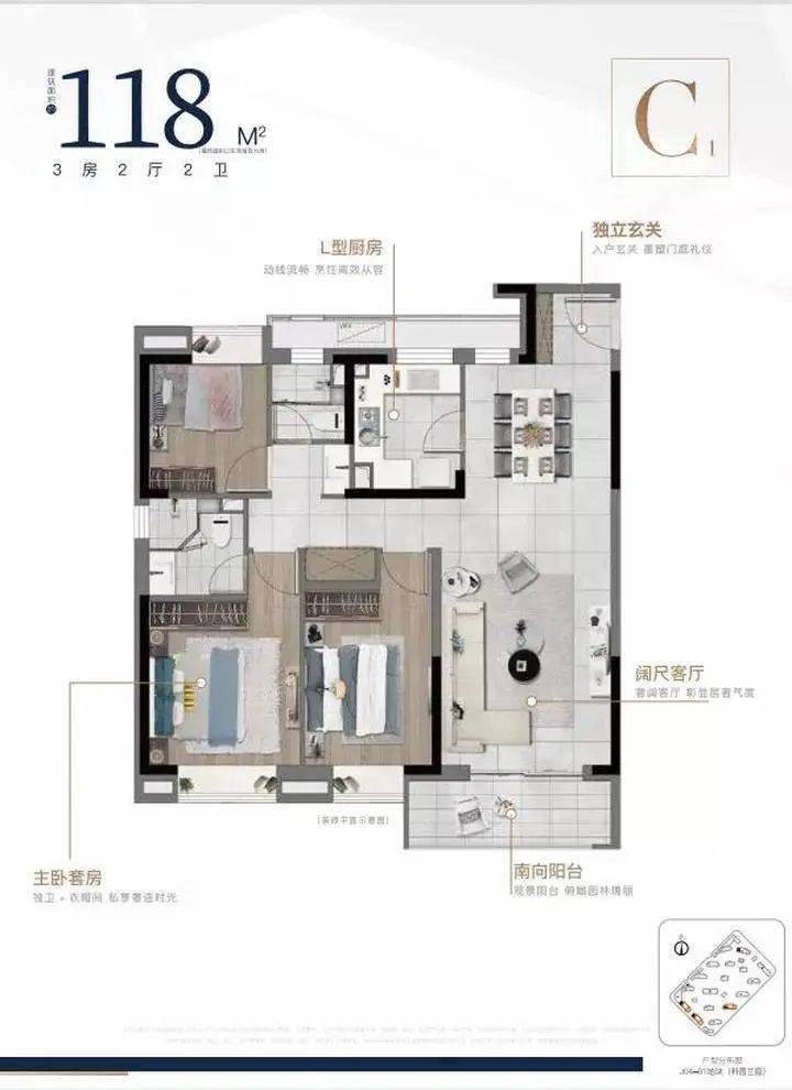 三开间朝南、客餐一体,建筑面积约118㎡户型: