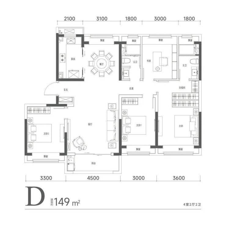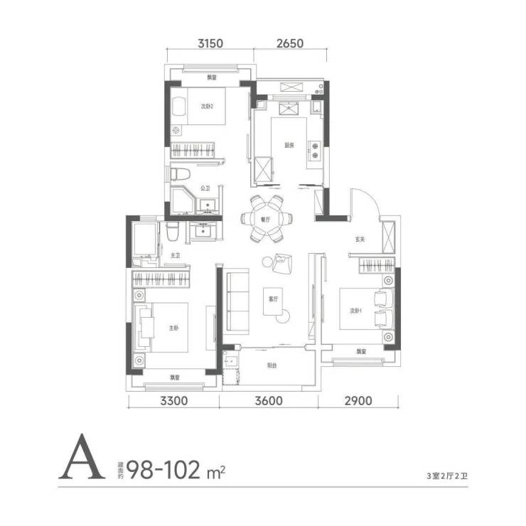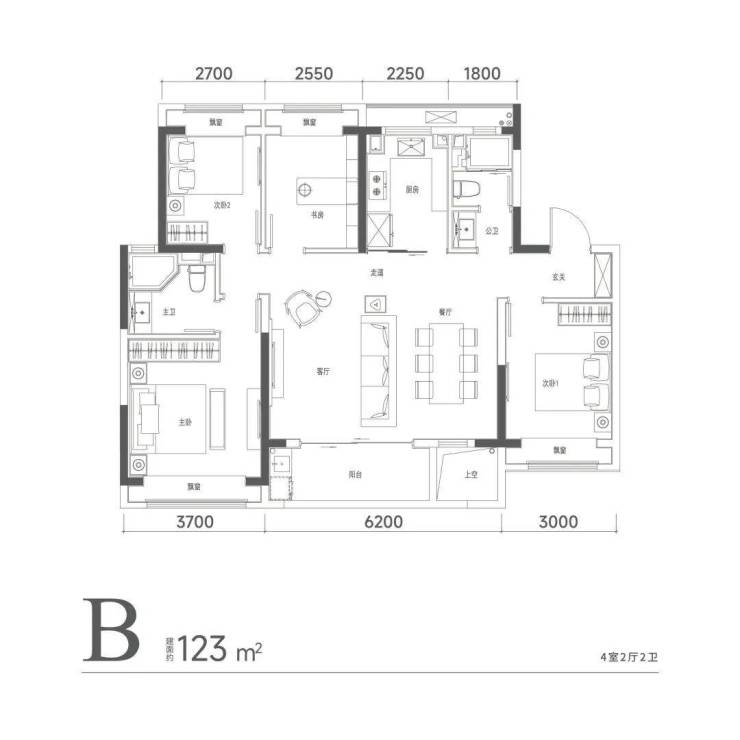 客厅横厅布局,面宽约6.2米;餐厅独立,宽度达3.25米,可放置多人就餐圆桌;南向三卧,双套房设计,主卧面宽约3.7米,带衣帽间、淋浴、浴缸。次房间宽也达3.3米;两个小房间开间也有3米和2.9米,都能放大床。另外,客厅连接约8㎡大阳台(不封阳台,算一半面积),整个社交区域方正、阔绰,待客、休闲皆从容自在。6个飘窗设置(不算面积)更很好延展了室内空间。在入户仪式感上,该户型还享独立电梯厅入户。