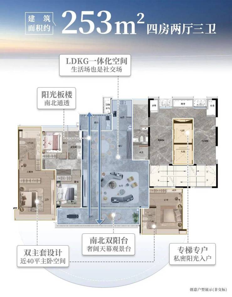 不需要千万预算,但它同样可以给你带来一步到位的高端生活。这个面积不仅享受大平层内外配套,也是纯粹的业主圈层同样享受专梯入户的。