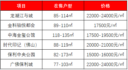 周边在售新盘包括龙湖江与城、金科铂悦都会、中海金玺公馆、时代印记(佛山)保利中央公园、广佛保利城,均价17500-24000元/㎡。