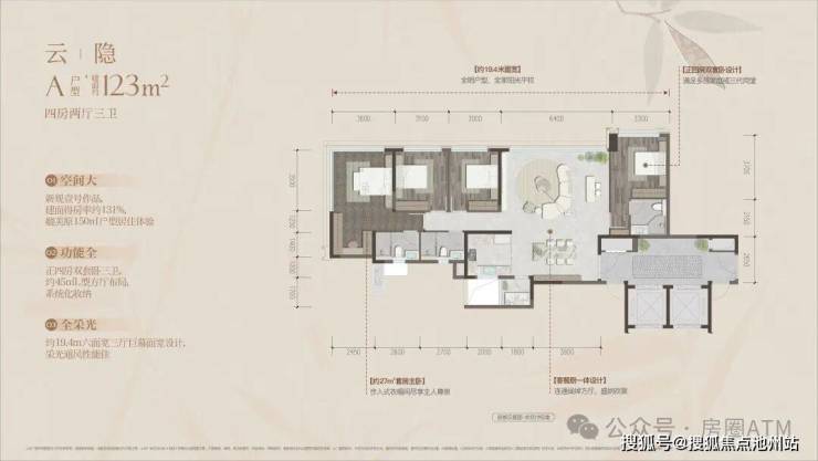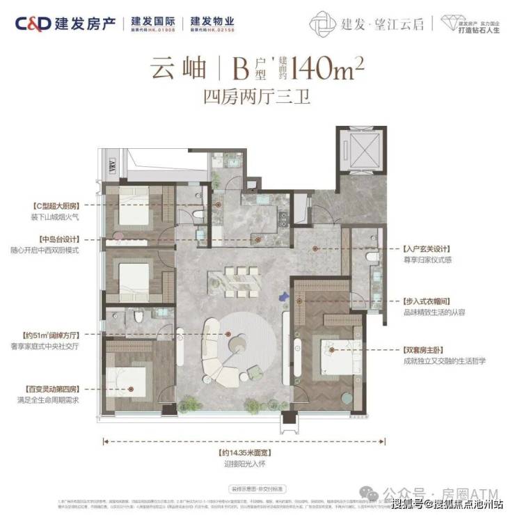 建面140㎡的户型更夸张:实得建面182㎡,不仅做了双套房设计,还配了约51㎡的“旋转方厅”,既能当家庭社交中心,也能拆分出独立空间;而建面185㎡的户型,实得直接冲到252㎡,不仅有三套卧、约18米南向面宽,还带挑高中庭庭院,相当于把“别墅感”搬进了高层里。
