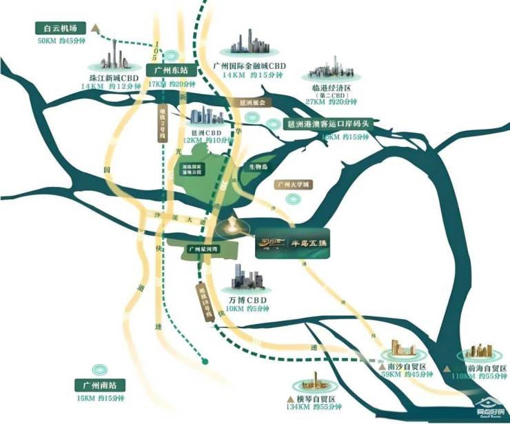 星河湾半岛五号位于番禺洛溪岛东端的岛尖位置,这个区域有着景观优势。它地处海上丝绸之路的源点,北望万亩果林、CBD 双塔,还能远眺白云山,南面与广州星河湾隔江相望,东北面与大学城及黄埔古港相邻。更值得一提的是,项目东、南、北三面均被宽阔的珠江环绕,江面最宽处达 1200 米,是广州规划的城市中心 “中央居住区”,能让业主独享三重景观,将江景、山景、城市景尽收眼底。