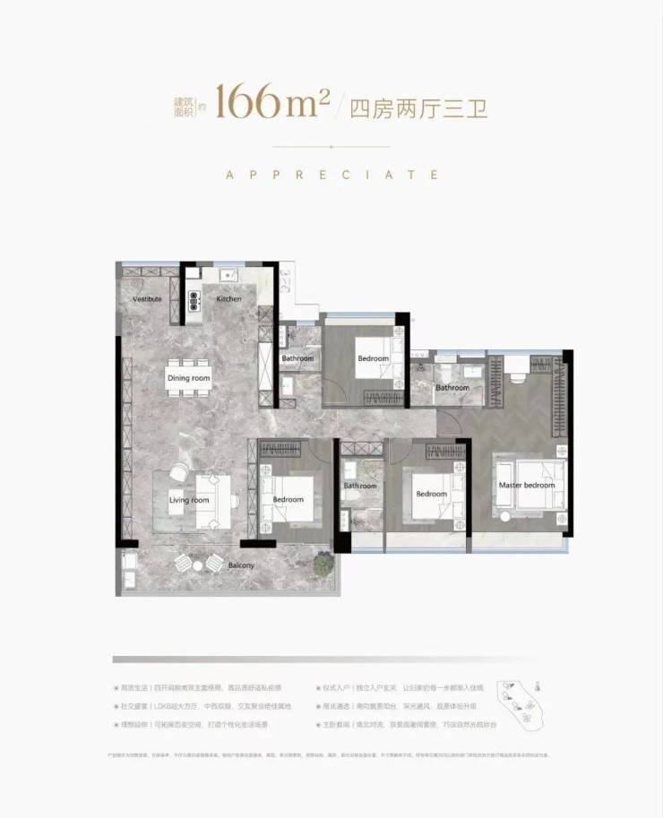 166平是四房两厅三卫户型,双主套设计,整体户型和103平类似。