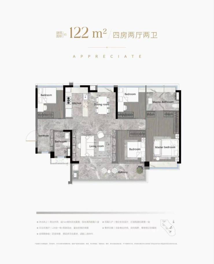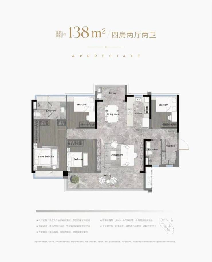 138平是四房两厅两卫户型,南北对流双阳台,主卧的空间感更好。