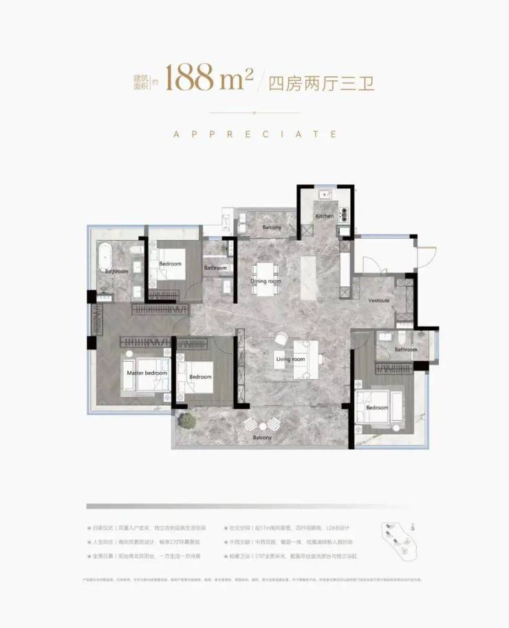 188平是四房两厅三卫户型,南北对流双阳台,双主套设计,空间感更好,更加实用,主卧的卫生间空间很大,而且带有270度采光。