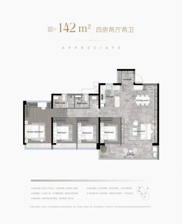 142平是四房两厅两卫户型,五开间朝南,整体户型和103平类似。