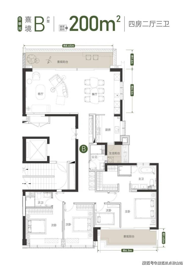 【稀缺爆款 熹境B户型】建面约200m²/204m² 4房2厅3卫,片区稀缺三阳台,山境城景皆享