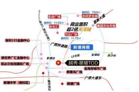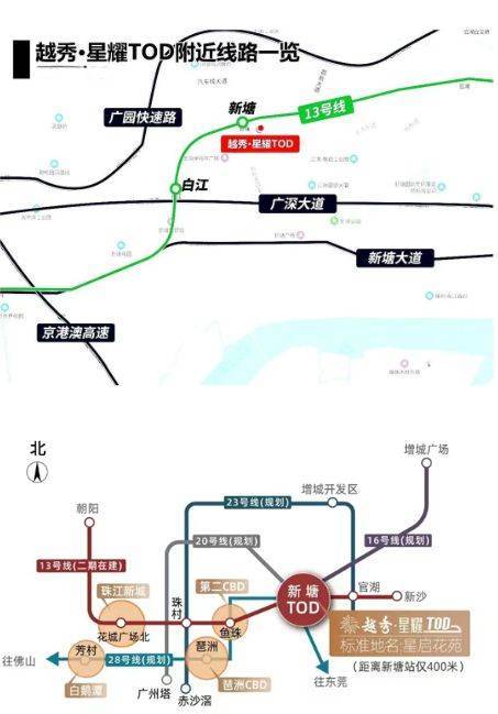 交通是越秀星耀TOD的一大亮点。项目距离地铁13号线新塘站仅400米,步行即可轻松到达。此外,新塘TOD枢纽集合了5条地铁线、3条高铁线和2条城轨线,形成了一个庞大的交通网络。通过这些交通设施,居民可以快速直达珠江新城、佛山千灯湖CBD、荔湾白鹅潭CBD、琶洲CBD等地,享受快捷的城市生活。