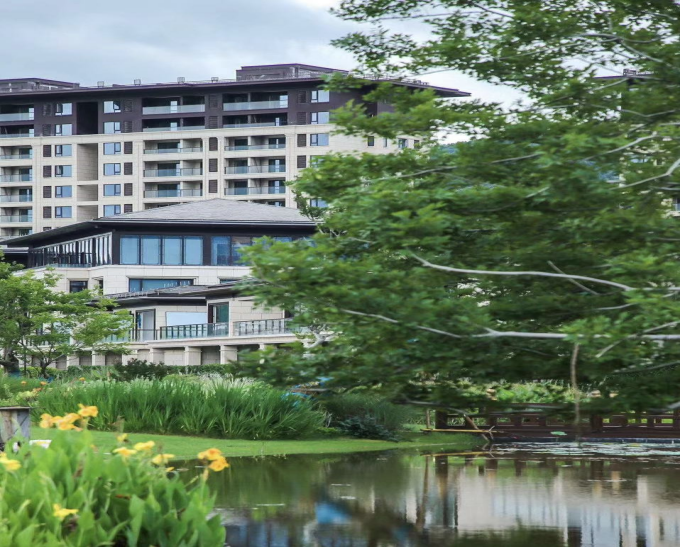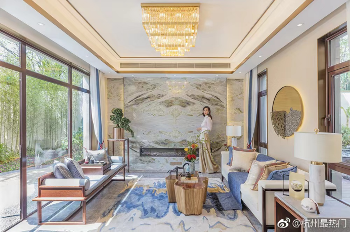 【设计理念】整体建筑呈现新中式风格,提取千岛湖自然山水元素与现代社会的居住环境相交融。她在半岛福址之上,得山环水抱,藏风聚气之利,揽青龙来水、白虎出水之势,继承人丁兴旺的家族理想。