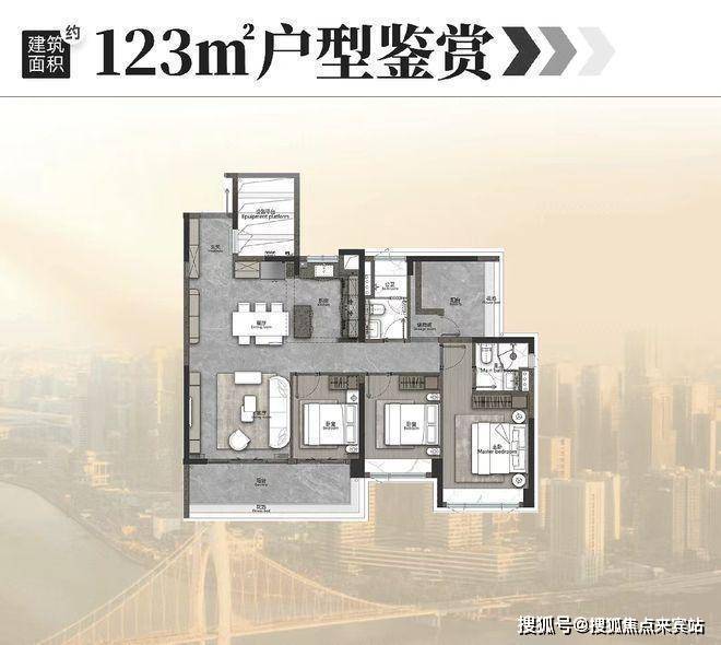 建面约123㎡四房+1多功能室:四开间朝南,双面宽景观阳台长约6.5米,室内采光通风畅意。魔方空间设计,如设备空间、厅卧都可做灵活空间,相当于在三房基础上再多两个多功能室。