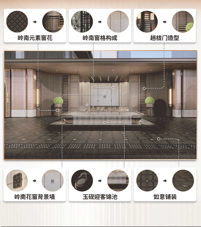 以四大名砚之首“广府端砚”为灵感打造迎客锦池,有青云得路、宏图大展的美好寓意,让业主每次归家都有满满仪式感。