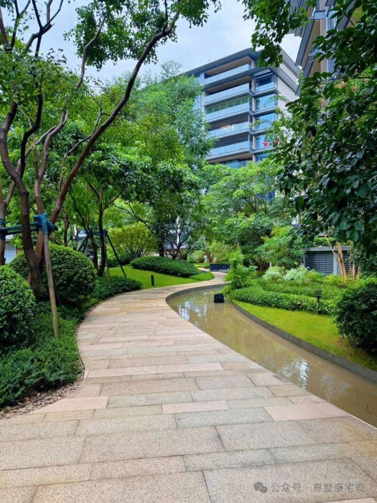 整个项目被抬高7米,园林比地面两层楼还高,环境很静谧,更适合日常游园。园林与小区内每栋建筑直接连通,方便融入业主日常生活,加上绿廊和水轴贯穿其中,带给人不少沉浸式体验。