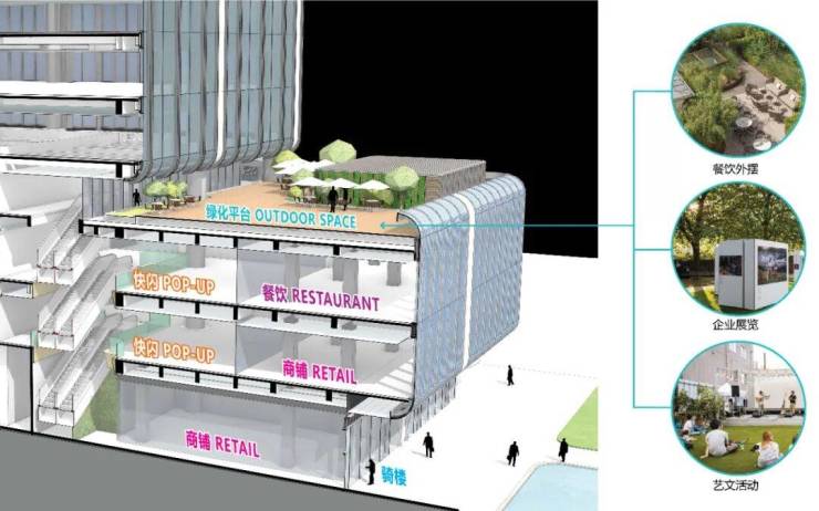 小区配套:包含商业、办公(自持+可售)与企业公馆等业态。在首层就借鉴传统“骑楼”建筑空间,将商业界面后退,形成面向城市公园的步行廊道,还能避风雨防日晒,对商务人士十分友好。裙房屋顶还打造了一个户外活动平台,日后可以实现企业展览、餐饮外摆、活动等功能。