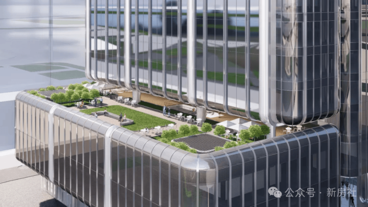项目在不同高度构建多层次的特色空间:首层借鉴传统“骑楼”建筑空间,将商业界面后退形成面向城市公园的步行廊道,可避风雨、防日晒;裙房屋顶的户外活动平台绿意盎然,形成自然友好的公共空间;塔楼顶部分别设置空中庭院与云端花园,提升空间体验与项目品质,同时激活城市天际线。