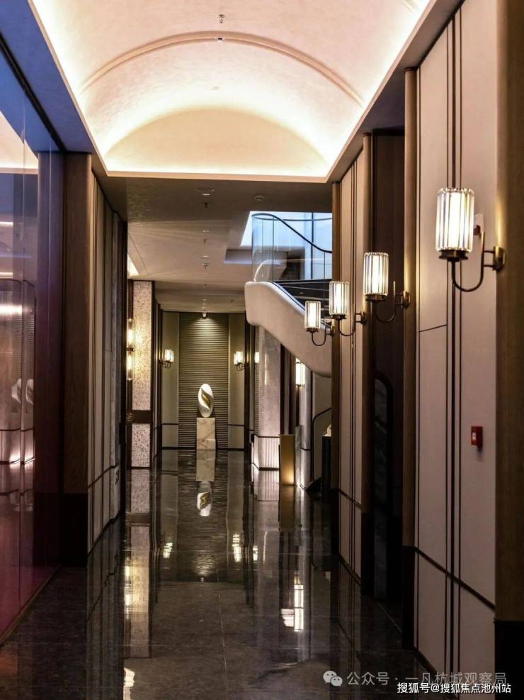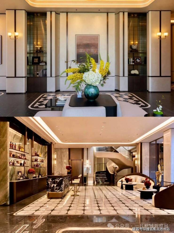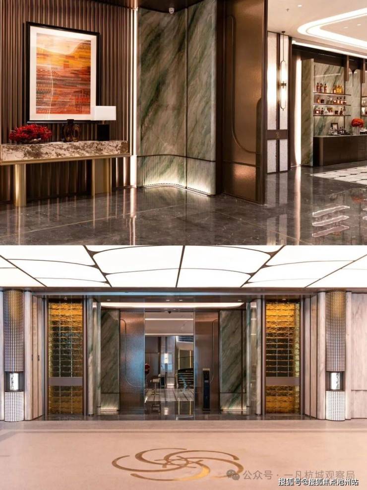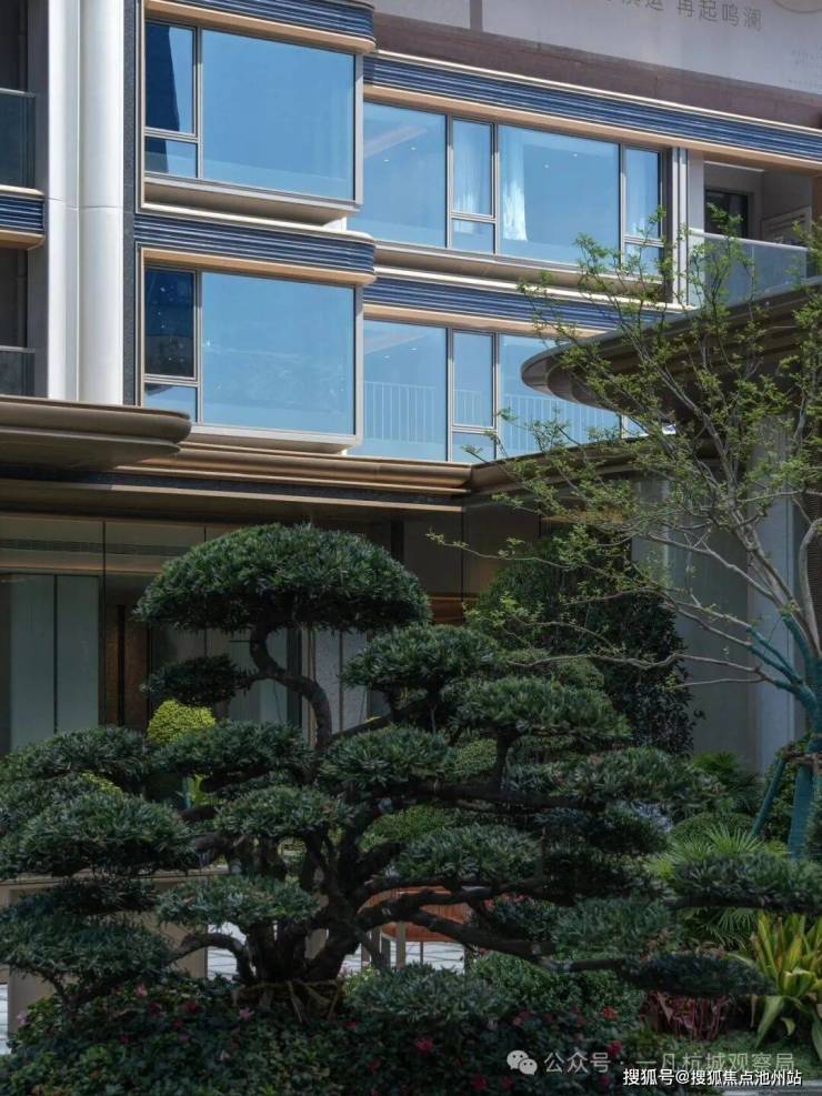 小区主入口设计为现代化酒店式门楼,跨度约66米,采用金属材质与玻璃结合。两侧石材景墙如屏风般展开,对植名贵罗汉松,整体十分气派,归家仪式感满满。