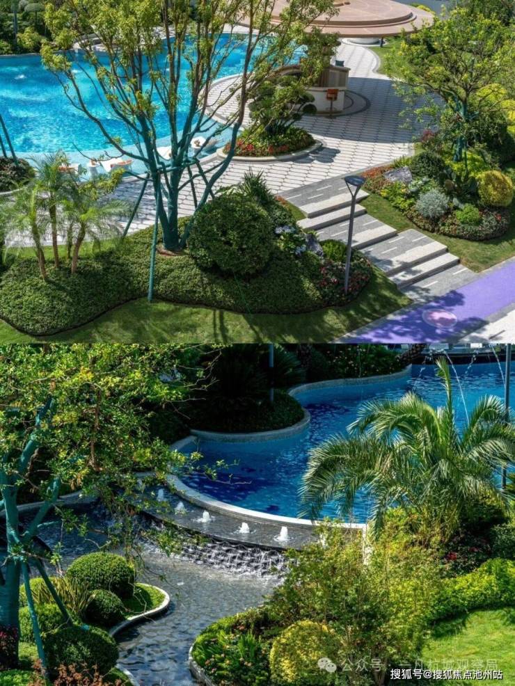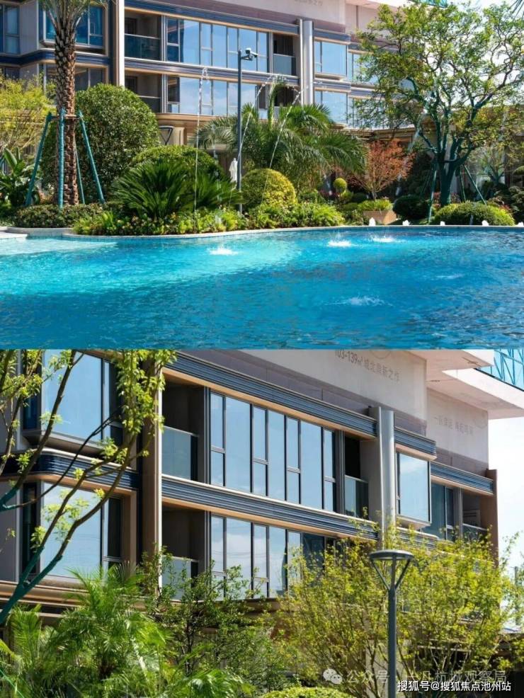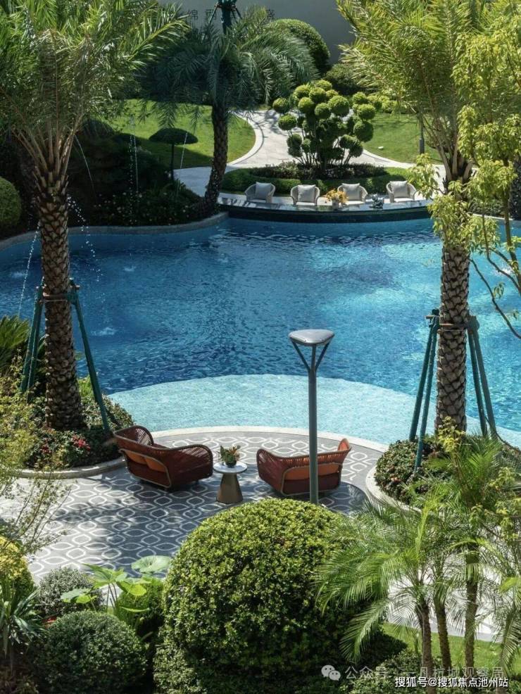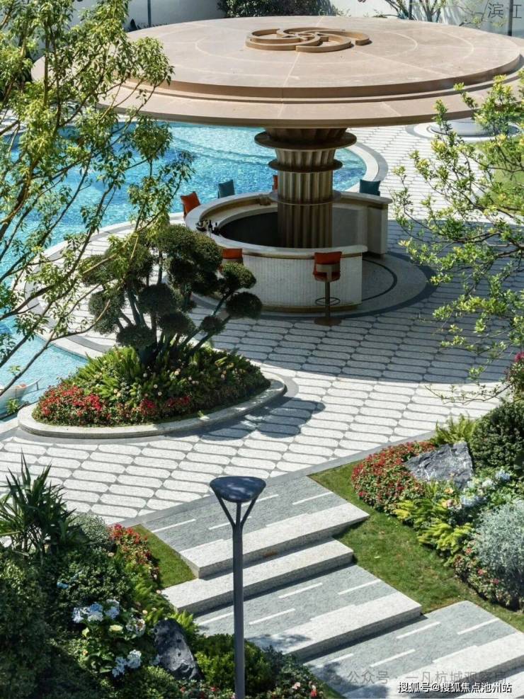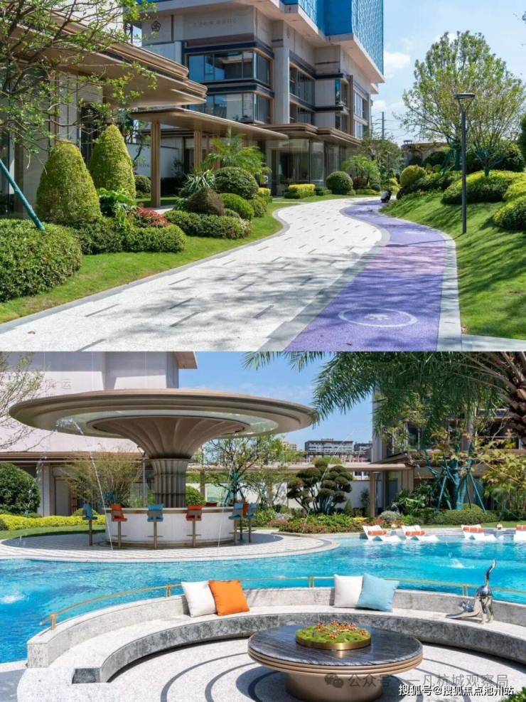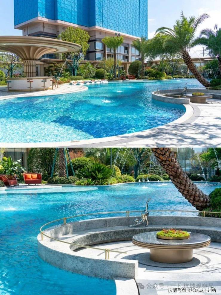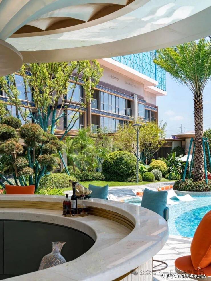 小区的园林景观一如既往延续了滨江的水准,中心区域设置了自然度假式的景观水池,配合棕榈等热带植物,结合着开放式酒廊和下沉卡座,整体度假氛围很不错。未来园区内还会设置童玩区等设施。