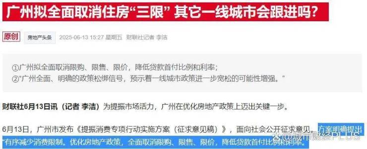 2025年6月,中国房地产市场迎来标志性事件:广州市政府正式发布《广州市提振消费专项行动施方案(征求意见稿)》,明确提出全面取消限购、限售、限价政策,并同步降低首付比例和房贷利率。这一政策不仅是对广州此前局部松绑的全面确认,更成为四大一线城市中首个彻底退出行政干预房地产市场的城市,释放出强烈的政策转向信号。