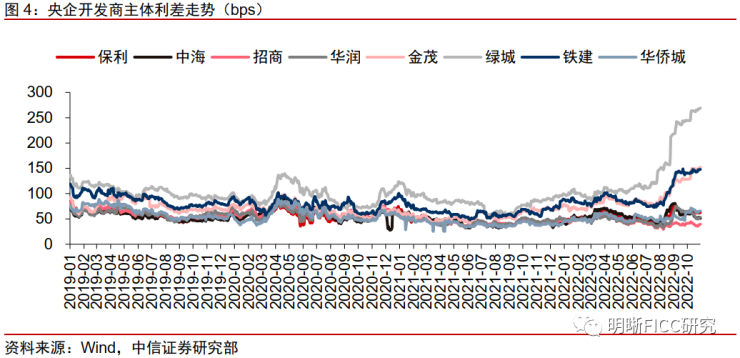 央企开发商之间的分化开始加剧,需关注一级发行的持续性。央企开发商当中,招商蛇口、中海、华润、保利的估值表现最为稳健,在行业危机之下,这些企业的主体利差始终控制在100bps以下,大部分时间内围绕50bps运行。它们的共同点包括:1、央企特别控股;2、再融资渠道通畅,2022年以来银行授信额度继续增加。但央企地产当中,也有一些主体出现了估值的波动,金茂、铁建地产的主体利差上升至150bps左右,绿城则上升至接近300bps,二级市场甚至已经出现90元以下的成交净价。在这样的二级市场价格之下,近期绿城仍然有一级新发,我们认为能够反映基石投债人的积极态度。以一级市场发行为前置判断条件,进行二级市场配置,或许是在央企地产中获取alpha的重要思路。