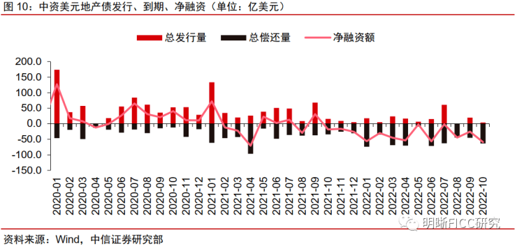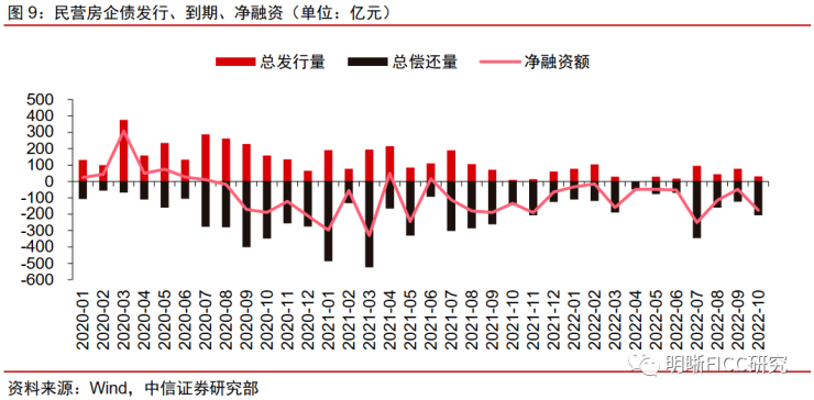 民企地产债融资乏力。我们关注民企地产债的一级市场表现,2022年10月,民企地产(含公众企业)境内债券发行2只,发行规模合计31亿元,净偿还176亿元。