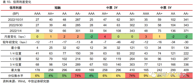 信用利差整体变化不大。2022年10月,信用利差变化不大,信用债走势基本跟随基利率。当前中高等级信用利差处于10%以下历史分位数,低等级则在75%历史分位数附近。