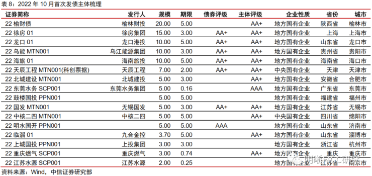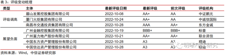评级调整梳理。2022年10月,评级被调高的主体共3个,展望为负面的主体有4个。